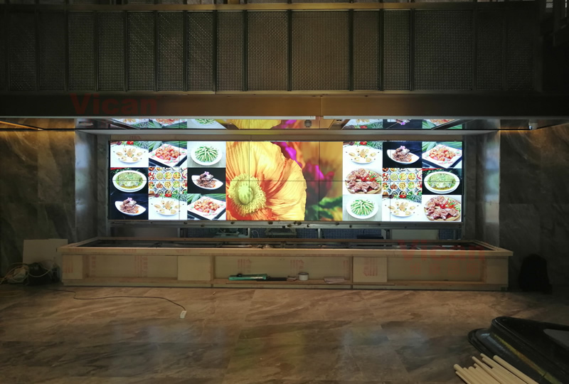 惠州海鮮酒店采用這套顯示大屏,采用2x5拼接、55寸液晶拼接屏,3.5mm拼縫,主要用來(lái)顯示美食特色與信息公告。