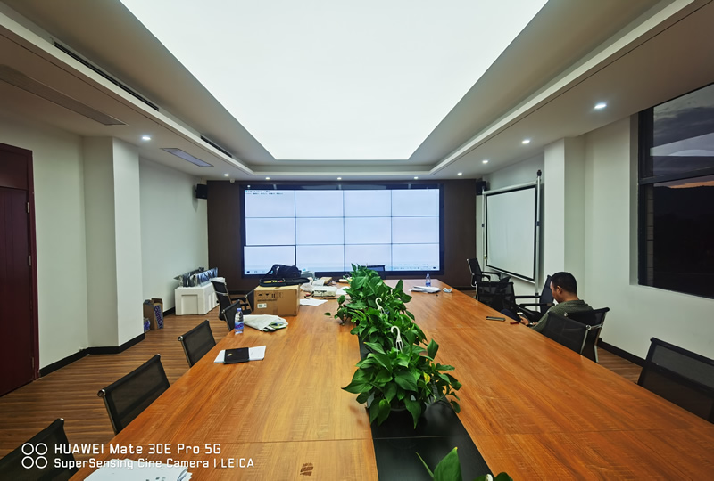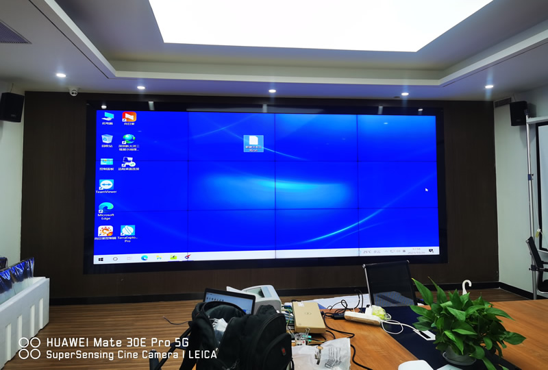 本案例中,維康國際為深圳市大鵬水利局提供了一套會議顯示大屏,由3x4、55寸液晶拼接屏組成,屏體為LG1.8mm原裝面板,采用前維護式安裝。