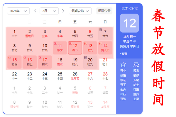 2021年2月1日-2021年2月20號(hào)為放假時(shí)間,2021年2月21日(正月初十)正式上班!