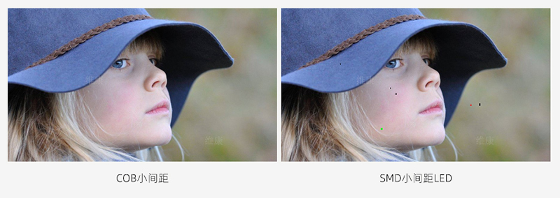 傳統(tǒng)LED顯示屏由于燈杯封裝較高、燈貼片過程中精度的誤差、面罩不平整三方面原因,造成可視角度降低,正??捎^看角度最大只有120左右;而COB封裝的燈杯較淺,而且無需面罩防護(hù),可視角度就增大到了150度左右。