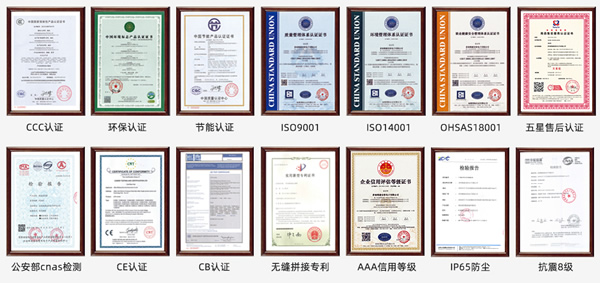 ISO9001、ISO14001、OHSAS18001、3C、節(jié)能認(rèn)證、環(huán)保認(rèn)證、檢測(cè)報(bào)告、防塵、CE、CB、FCC、ROHS、外觀專利、大屏軟件專利等。