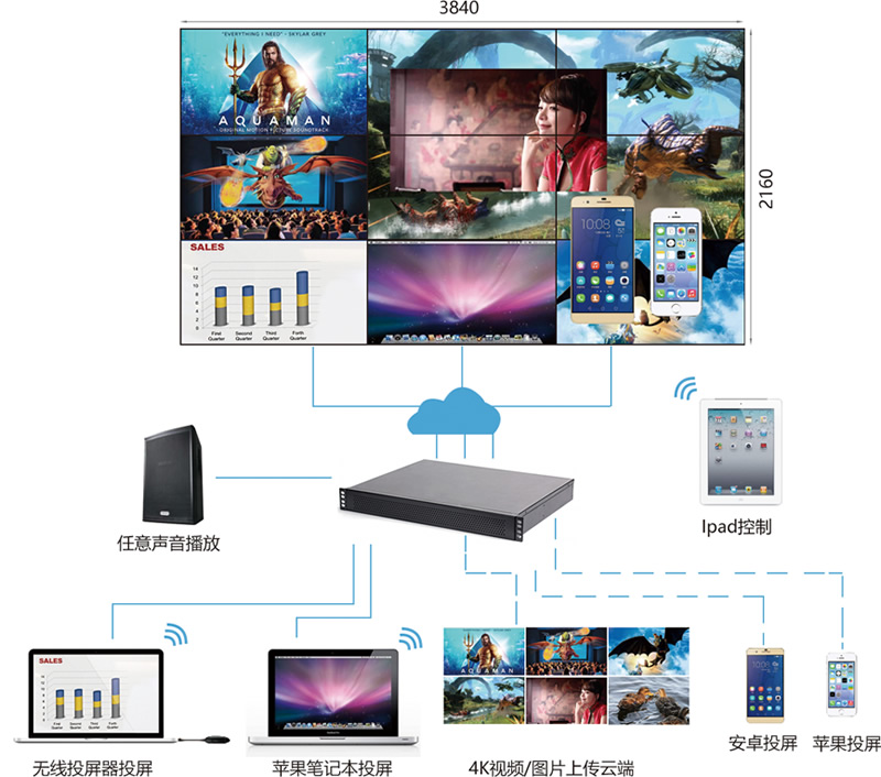 無需任何輸入,4K“融媒體”處理器拼接播放可達(dá)4K分辨率(3840*2160)。使用處理器及矩陣,需要4K輸入信號(hào)源并且配備雙鏈路輸入接口;成本高昂且操作性差。
